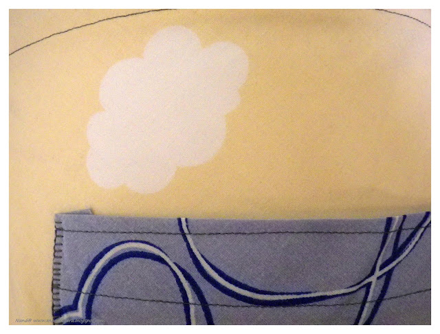 A capa foi o que me deu mais trabalho e sei que sustive a respiração quando cosi a parte de baixo (em amarelo) à parte de cima, em azul.